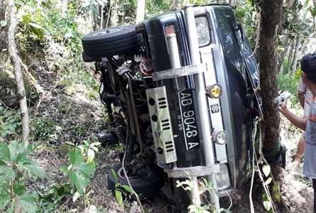 NGAWEN, Jumat Wage | Kecelakaan tunggal terjadi di Jalur Ngawen-Cawas pukul 09.00 WIB, Jumat (19/04). Tempat Kejadian Perkara (TKP) persisnya di Tanjakan Bundelan masuk wilayah Kabupaten Gunungkidul. Sepuluh penumpang bersama mobil masuk jurang, satu luka berat.