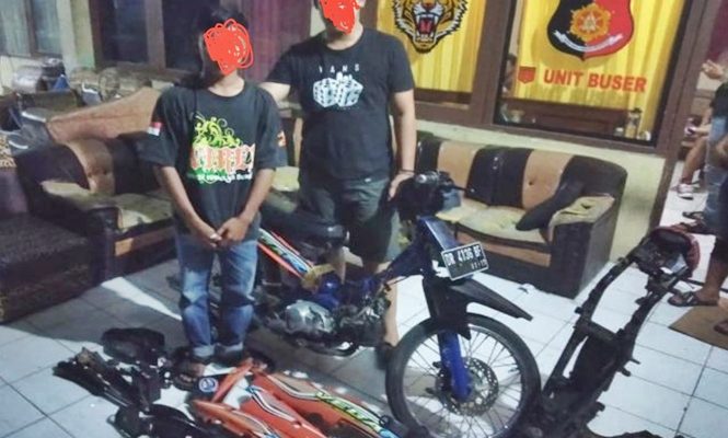 Barang bukti yang berhasil disita polisi berupa 1 unit sepeda motor Yamaha Vega warna biru orange yang dikendarai pelaku dengan nopol DR 4136 BF, 1 buah rangka motor Yamaha Vega, 1 (satu) pasang shock breaker, dan 1 (satu) pasang cover body milik yamaha Vega warna orange. (Joko)