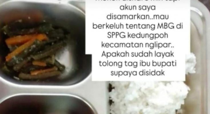 “Mohon dishare min tapi akun saya disamarkan…mau berkeluh tentang MBG di SPPG Kedungpoh kecamatan Nglipar..Apakah sudah layak tolong tag ibu bupati supaya disidak,” tulisnya.