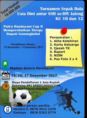 WONOSARI, Kamis Kliwon—Turnamen sepak bola usia dini antar SSB (Sekolah Sepak Bola) Jateng-DIY bertajuk Putra Handayani Cup III bakal digelar mulai 15 -17 Desember 2017 di Stadion Gelora Handayani, Jeruksari, Wonosari. Turnamen ini memperebutkan Thropy Bupati Gunungkidul dan hadiah puluhan juta rupiah dan mulai kemarin dilakukan pendaftaran.