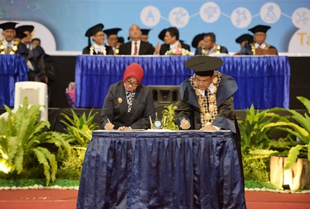 YOGYAKARTA – Kamis Pon | Universitas Negeri Yogyakarta (UNY) menjalin kerjasama dengan Pemerintahan Kabupaten (Pemkab) Gunungkidul di bidang Penyelenggaraan Pendidikan di luar Domisili (PPD), Selasa, (21/05). Penandatanganan kerjasama dilaksanakan bersamaan dalam acara Upacara Dies UNY ke 55 di Gedung Olahraga UNY.