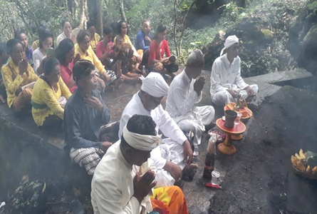 Sebelum memasuki area persembahyangan, Jero Gede Dwijo Triman memimpin segenap umat Hindu melakukan upacara kecil buka pintu, dengan menyentuh tanah tiga kali.