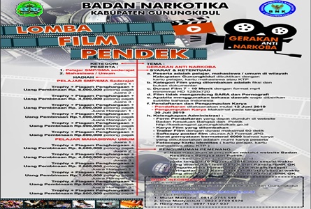 WONOSARI-Jumat Kliwon | Badan Narkotika Kabupaten Gunungkidul membuka peluang berbentuk lomba memproduksi film pendek jenis fiktif, bukan dokumenter bagi pelajar SMP, SMA sederajat, mahasiswa, dan umum. Peminat bisa mendaftar mulai 12 Juni, pengumpulan karya maksimal 30 Juni 2019.
